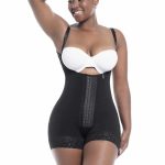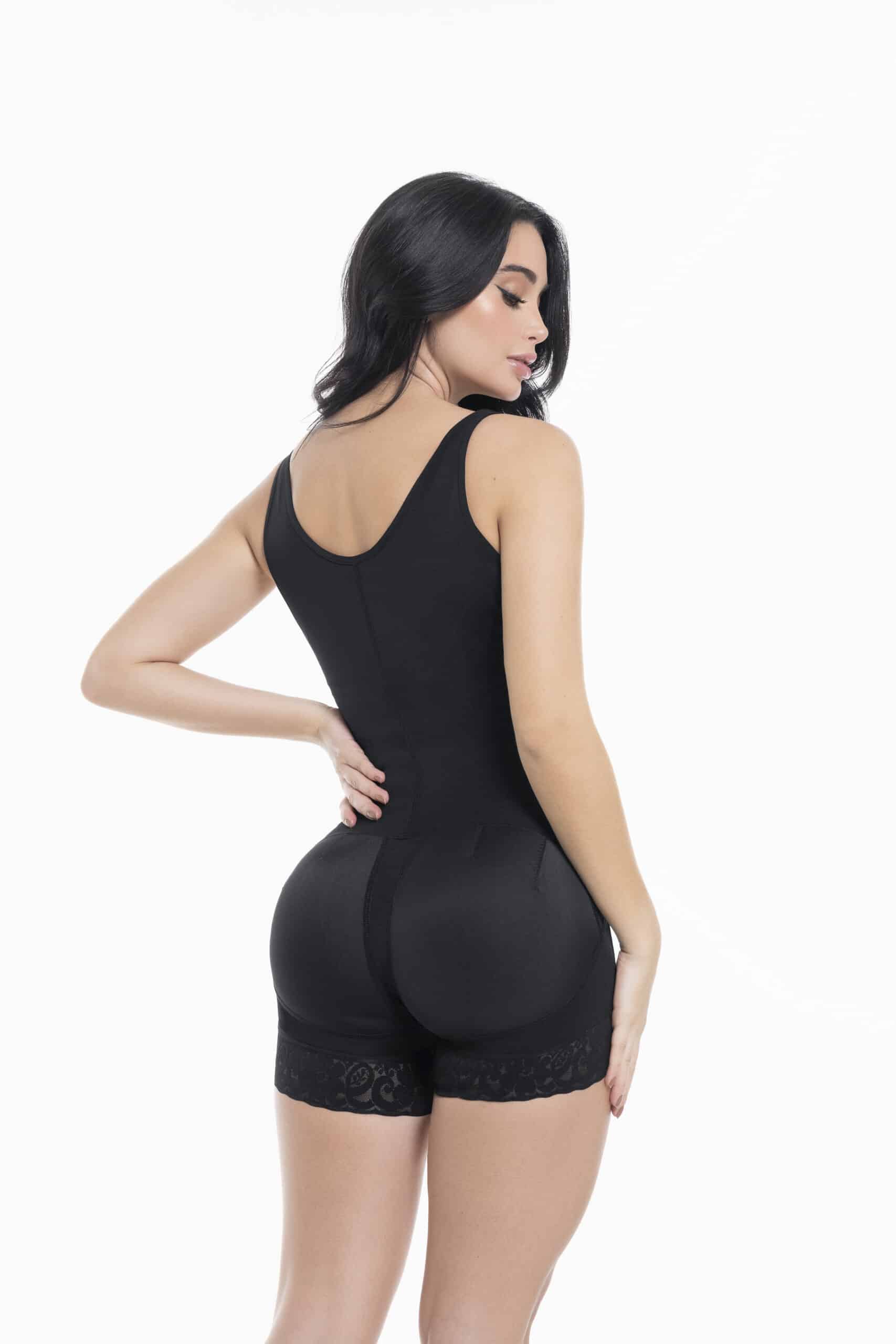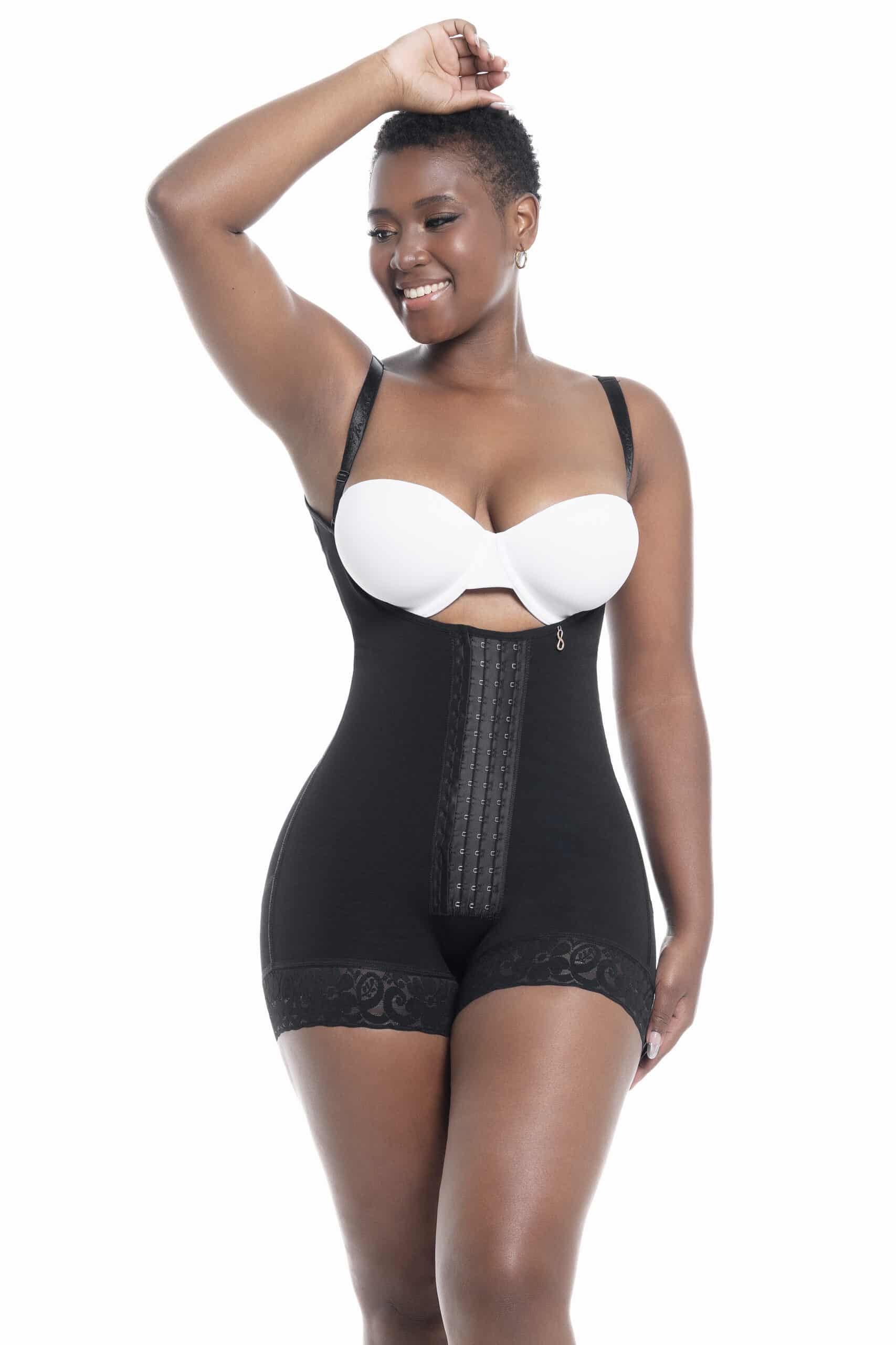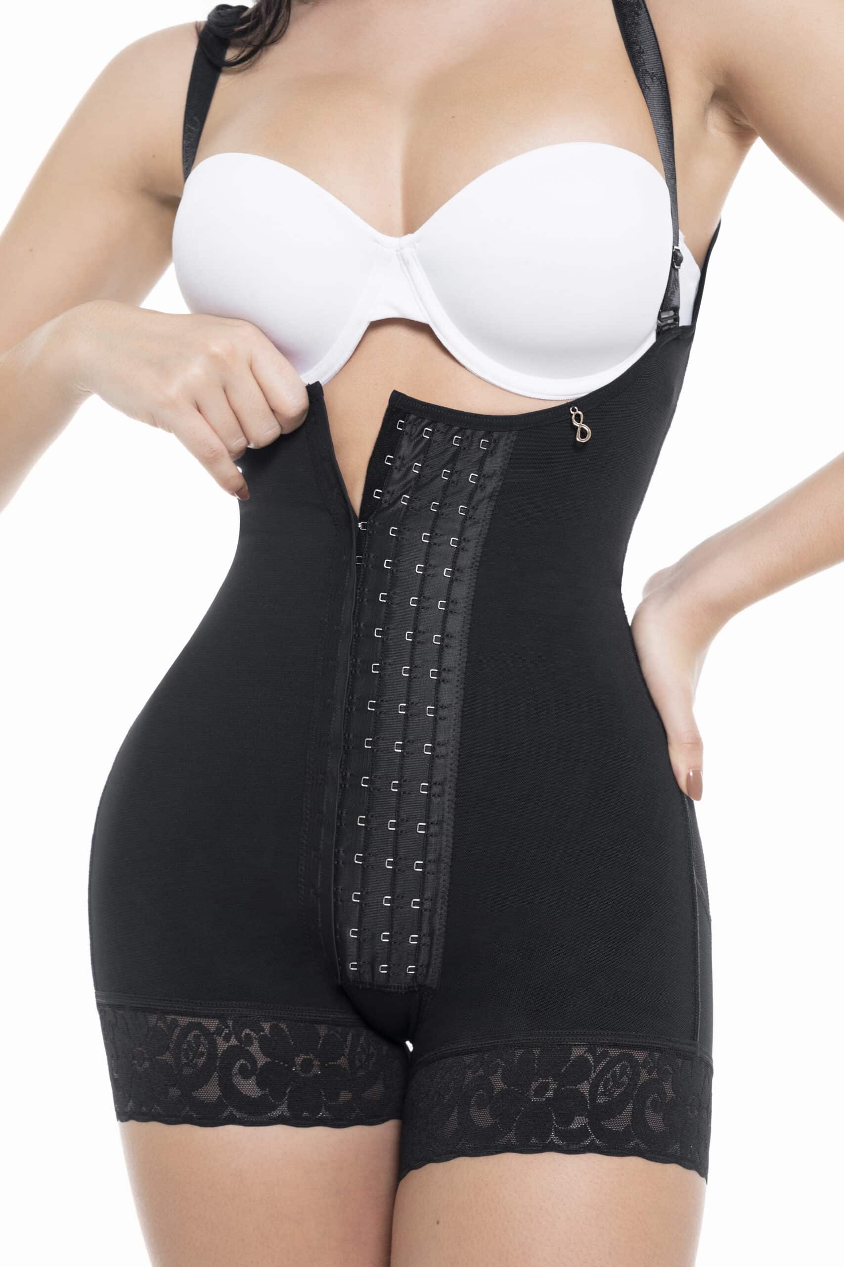 This short model features strong compression, with four rows of hooks that allow you to tighten it gradually during your recovery. The straps are thin and adjustable, and the back is covered. The buttocks are beautifully lifted thanks to a built-in butt-lifter.