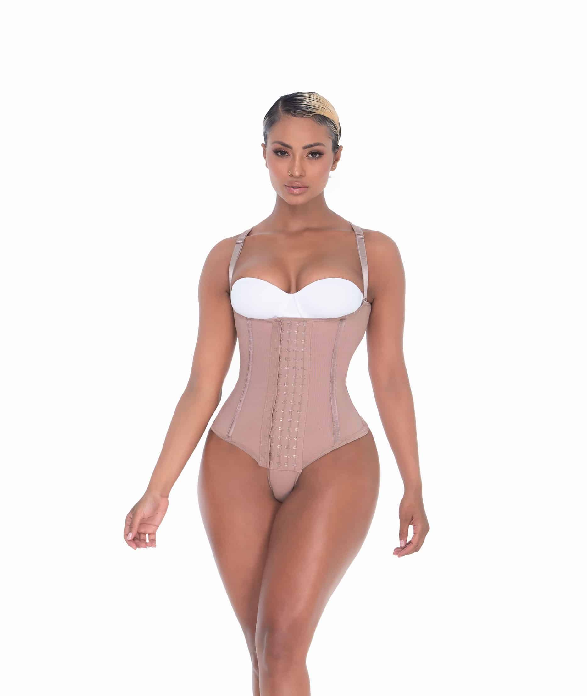 Introducing our new string bodysuit, designed with four boning to define your waist and sculpt your silhouette. This bodysuit features four rows of hooks for adjustable compression, made from powernet fabric.