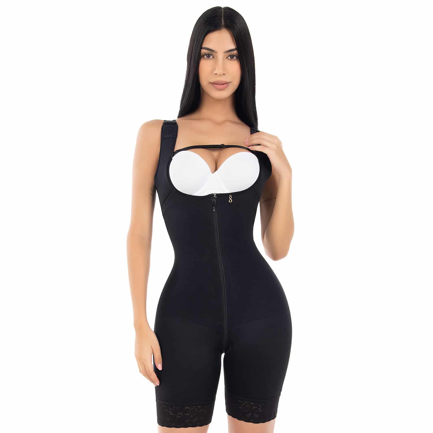 Combinaison très gainante avec remonte fesses léger, dos couvert et bretelles rembourrées.